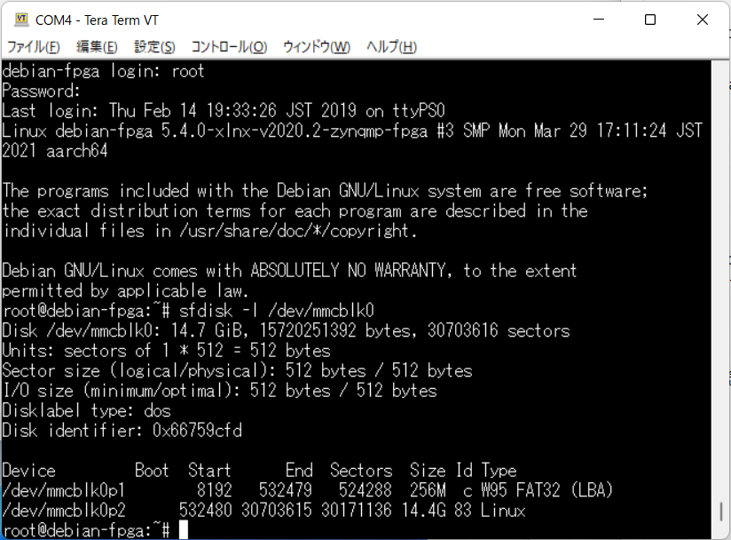 上の例だと クラスタサイズが 512 bytesで、SDカード全体で 30703616 sectors と知ることができます。また 16G のSDカードなのに 2G しか Linux パーテーションがないこともわかります。