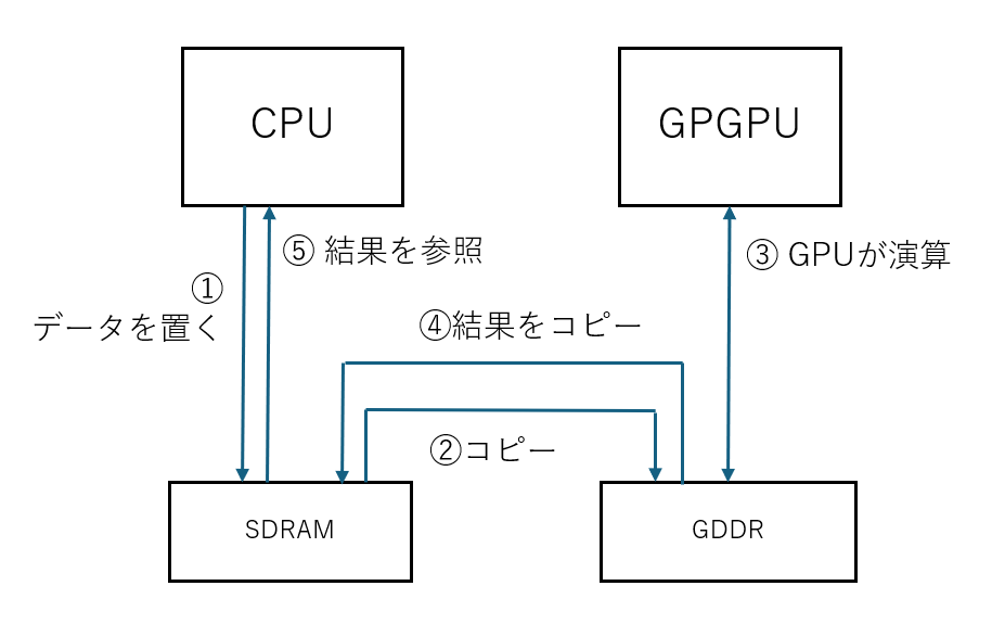 ホストメモリとは別にGPGPUにメモリがあることで課題となるのが、ホストCPU のメモリとGPGPU側のメモリの間のコピーやデータ配置です。