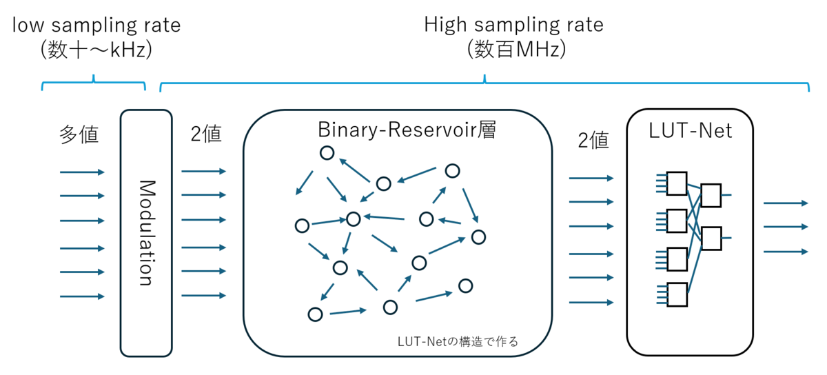 LUT-Network の構造は非常にシンプルがゆえに高周波数で動かすことができますので、Reservoir 部分も含めて LUT-Net の構造で作成すれば非常に高いサンプリングレートで動作できると考えられます。
